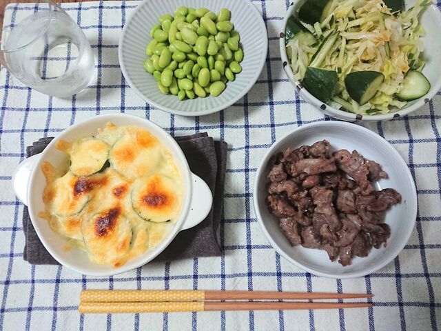 って炒めただけの定番砂ずり、ズッキーニのチーズかけ、レタスサラダ、冷凍枝豆