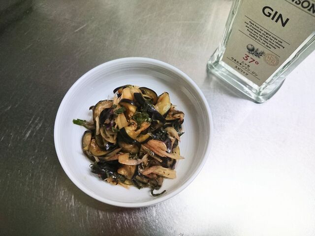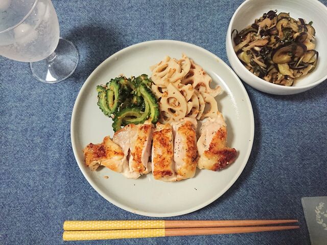なすとミョウガ、大葉のポン酢和えと作り置きゴーヤ、蓮根きんぴら、チキン