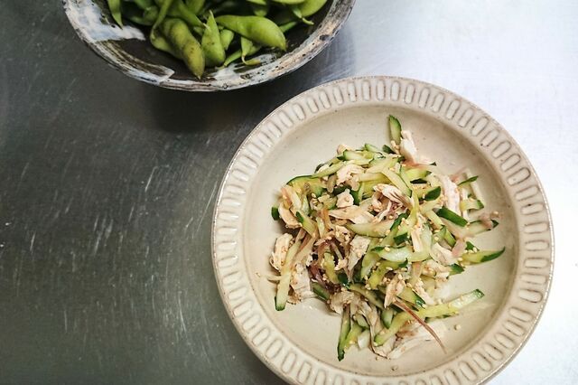 冷蔵庫にあったものーキュウリ、ささみ、茗荷を煎りゴマとポン酢で和えたもの