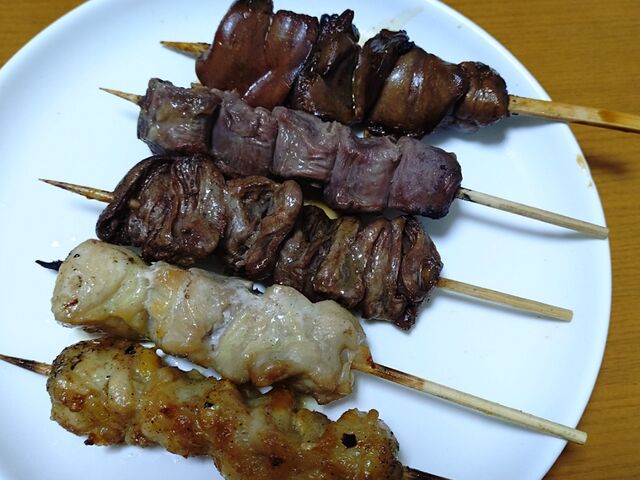 肝、砂ずり、ハツ、皮、ぼんじり(写真のはかしわかな?)